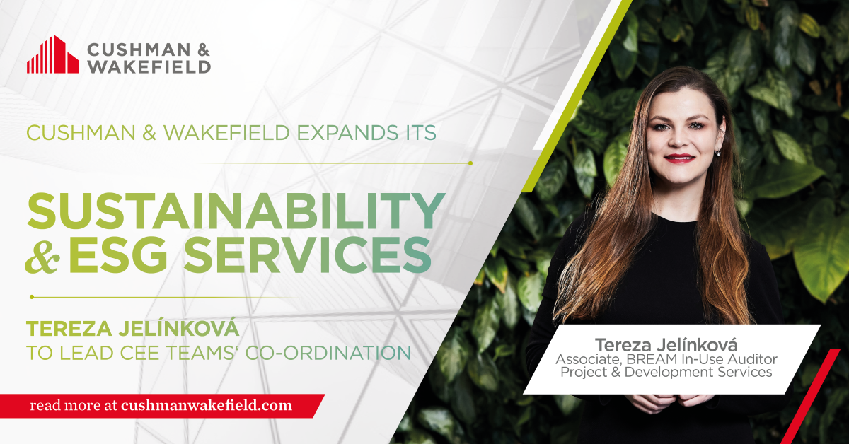 Międzynarodowa firma doradcza Cushman & Wakefield rozbudowuje ofertę usług w obszarze zrównoważonego rozwoju i ESG[1]. W celu zminimalizowania wpływu na środowisko naturalne budowy, eksploatacji i rozbiórki budynków, Cushman & Wakefield zapewnia klientom kompleksowy pakiet usług umożliwiających prowadzenie działalności na rynku nieruchomości zgodnie z wymogami, trendami i regulacjami w zakresie zrównoważonego rozwoju. W regionie Europy Środkowo-Wschodniej prace zespołów ds. zrównoważonego rozwoju w Cushman & Wakefield będzie koordynowała Tereza Jelínková.