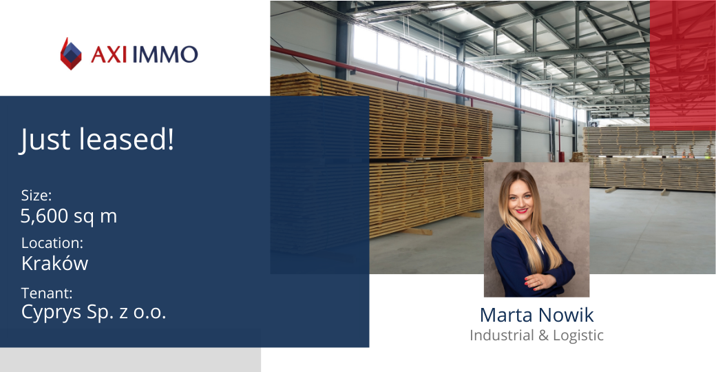 Producent i dostawca gotowych systemów meblowych, firma Cyprys Sp. z o.o. zdecydowała się na wynajęcie 5 600 mkw. nowoczesnej powierzchni magazynowej i biurowej w prywatnej inwestycji po wschodniej stronie Krakowa. Firma AXI IMMO odpowiadała za kompleksowe usługi doradcze, w tym reprezentowanie Klienta w negocjacjach.