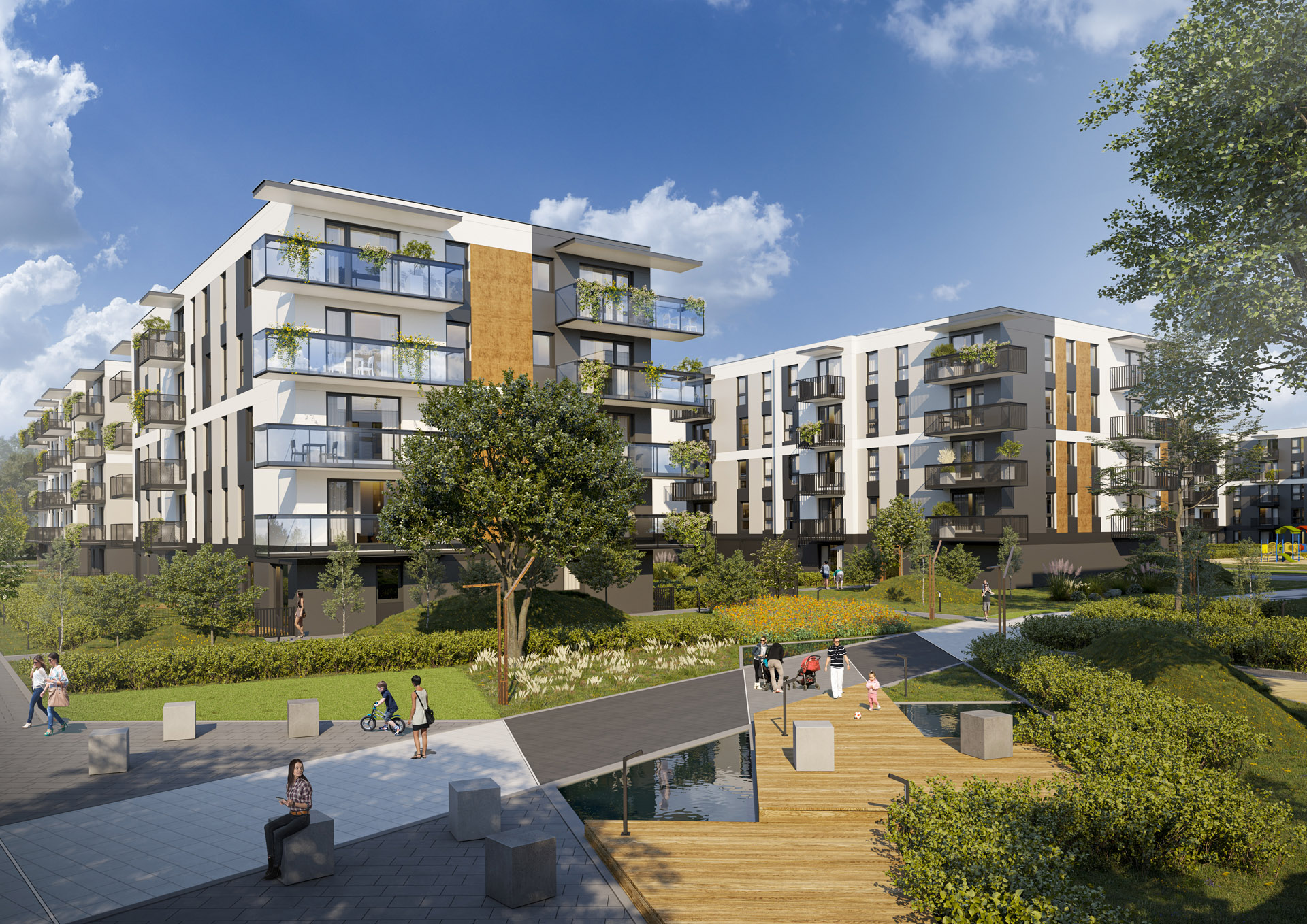 Centralnym punktem Alei Praskich będzie przestronny, wewnętrzy dziedziniec z dużą ilością drzew i roślin tlenowych, placem zabaw, siłownią plenerową i tężnią solankową. Deptaki pomiędzy budynkami uatrakcyjnią drewniane pomosty i tarasy podświetlone dyskretnym LED-owym światłem oraz elementy wodne, przy których staną wygodne siedziska i ławki. Główny ciąg komunikacyjny i wnętrza kwartałów osiedla urozmaicą wytłumiające hałas sztuczne pagórki. Powierzchnie zielone zostaną pokryte łąkami kwietnymi, zapewniającymi odpowiednie warunki dla zapylaczy i innych owadów. Podobnie jak wcześniejsze dwa etapy, także ten będzie certyfikowany w międzynarodowym systemie BREEAM. Otrzymanie takiego wyróżnienia zaświadcza, że dany obiekt został zrealizowany według najlepszych standardów i z troską o zdrowie oraz dobre samopoczucie mieszkańców.