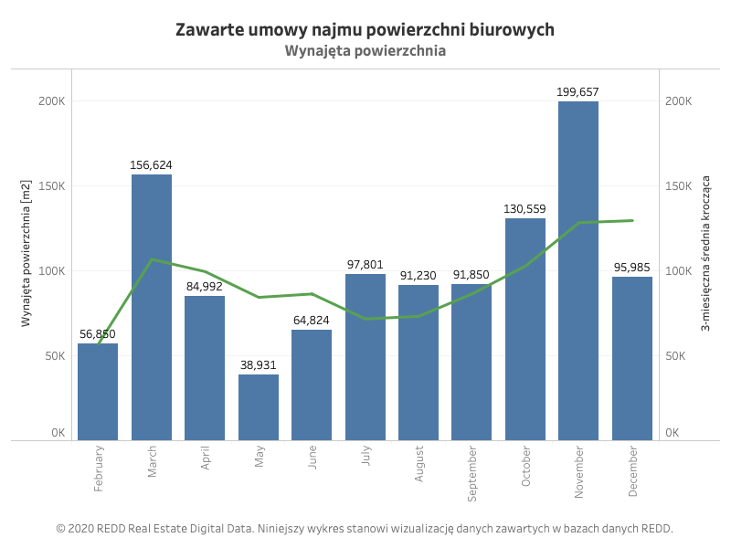 Analitycy REDD, niezależnej platformy dostarczającej dane o rynku biurowym w Polsce, informują, że czwarty kwartał 2020 roku będzie rekordowy na rynku biurowym. Do poniedziałku 21 grudnia zanotowaliśmy już 1580 nowych umów najmu, co stanowi 42% wszystkich umów zarejestrowanych w 2020 roku.