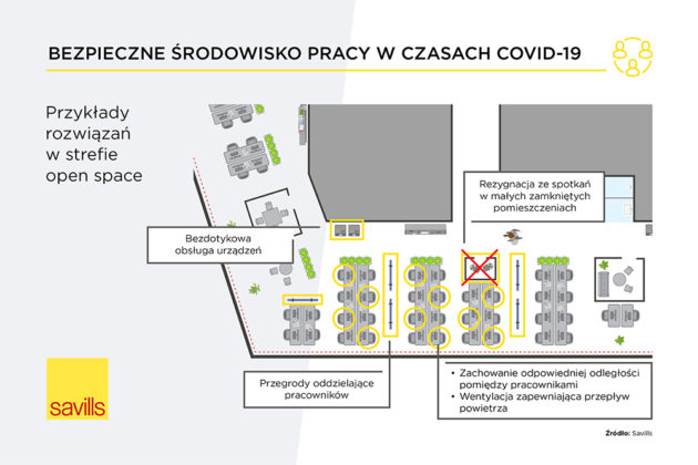 Główne wytyczne dotyczące środowiska pracy nie odbiegają od aktualnych zaleceń Światowej Organizacji Zdrowia oraz Głównego Inspektoratu Sanitarnego odnośnie wszystkich innych miejsc, w których może dojść do kontaktu z drugą osobą. Obowiązuje zatem reguła dystansu społecznego oraz bezwzględne przestrzeganie zasad higieny. Większość procedur, jakie firma Savills rekomenduje firmom przygotowującym się na powrót pracowników, opiera się na skutecznym informowaniu pracowników o powyższych zasadach oraz takiej reorganizacji pracy biurowej, która ułatwi ich przestrzeganie.
