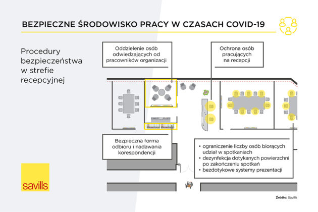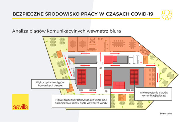Jak proponuje Savills, o ile pozwala na to plan danego biura, można rozważyć wprowadzenie ruchu jednostronnego w ciągach komunikacyjnych i wydzielenie obszarów najbardziej narażonych na kontakt z osobami spoza firmy. W przypadku biur, które odwiedza duża liczba klientów, jednym z opcjonalnych rozwiązań pozwalających chronić pracowników recepcji jest zainstalowanie szyby z pleksi. W biurze wskazane jest także czasowe wyłączenie z użytkowania stref relaksu oraz zminimalizowanie liczby osób korzystających z kuchni i sal konferencyjnych. Dobrze jest, jeśli pomiędzy spotkaniami zaplanowane zostaną przerwy pozwalające na wymianę powierza w sali. Warto również skontaktować się z zarządcą budynku, by zapytać o procedurę korzystania z wind, punktów handlowych i gastronomicznych dostępnych w obiekcie oraz upewnić się czy zwiększona została częstotliwość sprzątania i dezynfekcji na powierzchniach wspólnych.